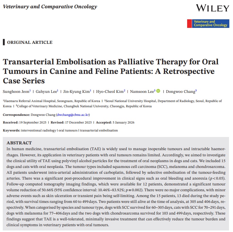 전성훈 센터장은 우선, 최근 SCI/SCIE 등재 학술지 Veterinary Comparative Oncology에 게재된 구강 종양 색전술 회고 분석 연구를 소개했다.
