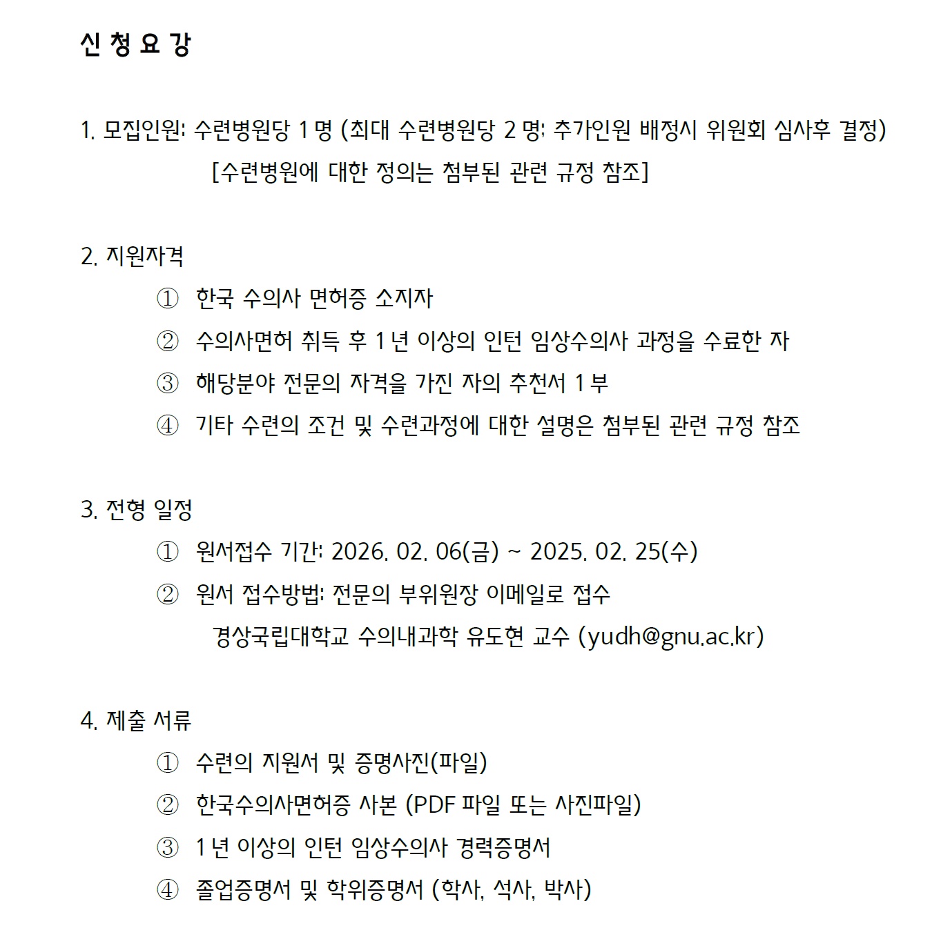 2026년 한국수의내과전문의 수련의 과정 모집..25일까지 원서접수