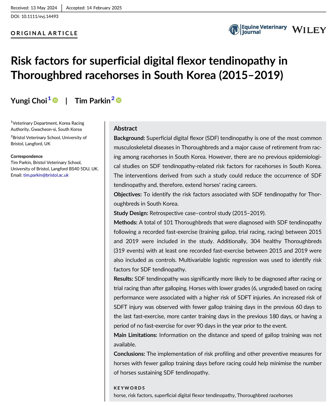 우선, 한국마사회 최윤기 수의사와 영국 브리스톨대 Tim Parkin 교수가 공동 연구한 ‘한국 경주마의 천지굴건 질환(SDF tendinopathy) 위험 요인’ 연구가 지난해 3월 말수의학 분야 최고 권위 학술지인 EVJ(Equine Veterinary Journal)에 게재됐다(Risk factors for superficial digital flexor tendinopathy in Thoroughbred racehorses in South Korea (2015–2019)).