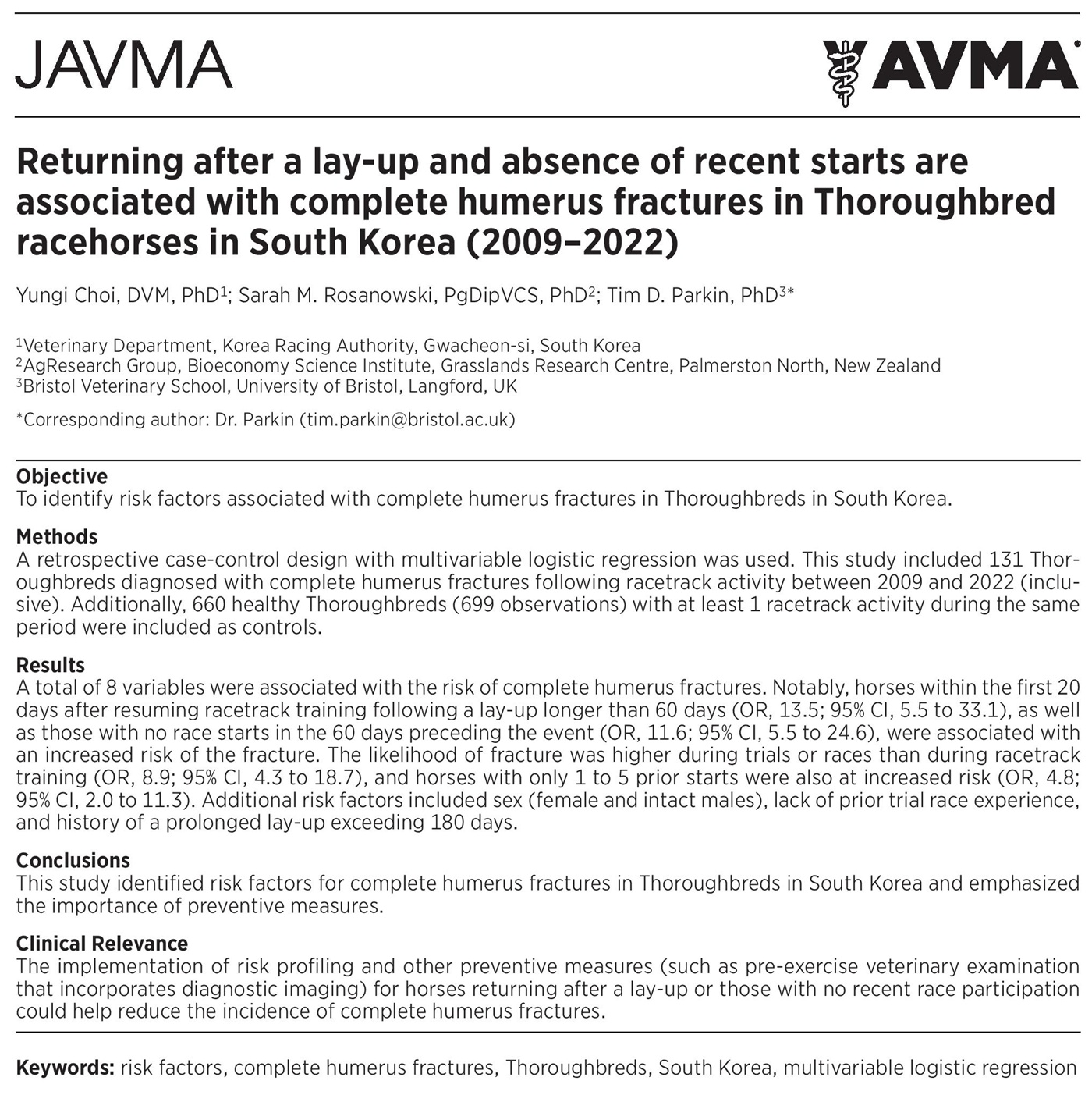 올해 1월에는 최윤기 수의사와 Tim Parkin 교수, 그리고 뉴질랜드 AgResearch 그룹의 Sarah Rosanowski 수석연구원이 공동 연구한 ‘국내 경주마의 상완골 완전골절(complete humerus fracture) 위험요인’ 연구가 미국수의사회(AVMA) 학술지 JAVMA에 게재됐다(Returning after a lay-up and absence of recent starts are associated with complete humerus fractures in Thoroughbred racehorses in South Korea (2009–2022)).