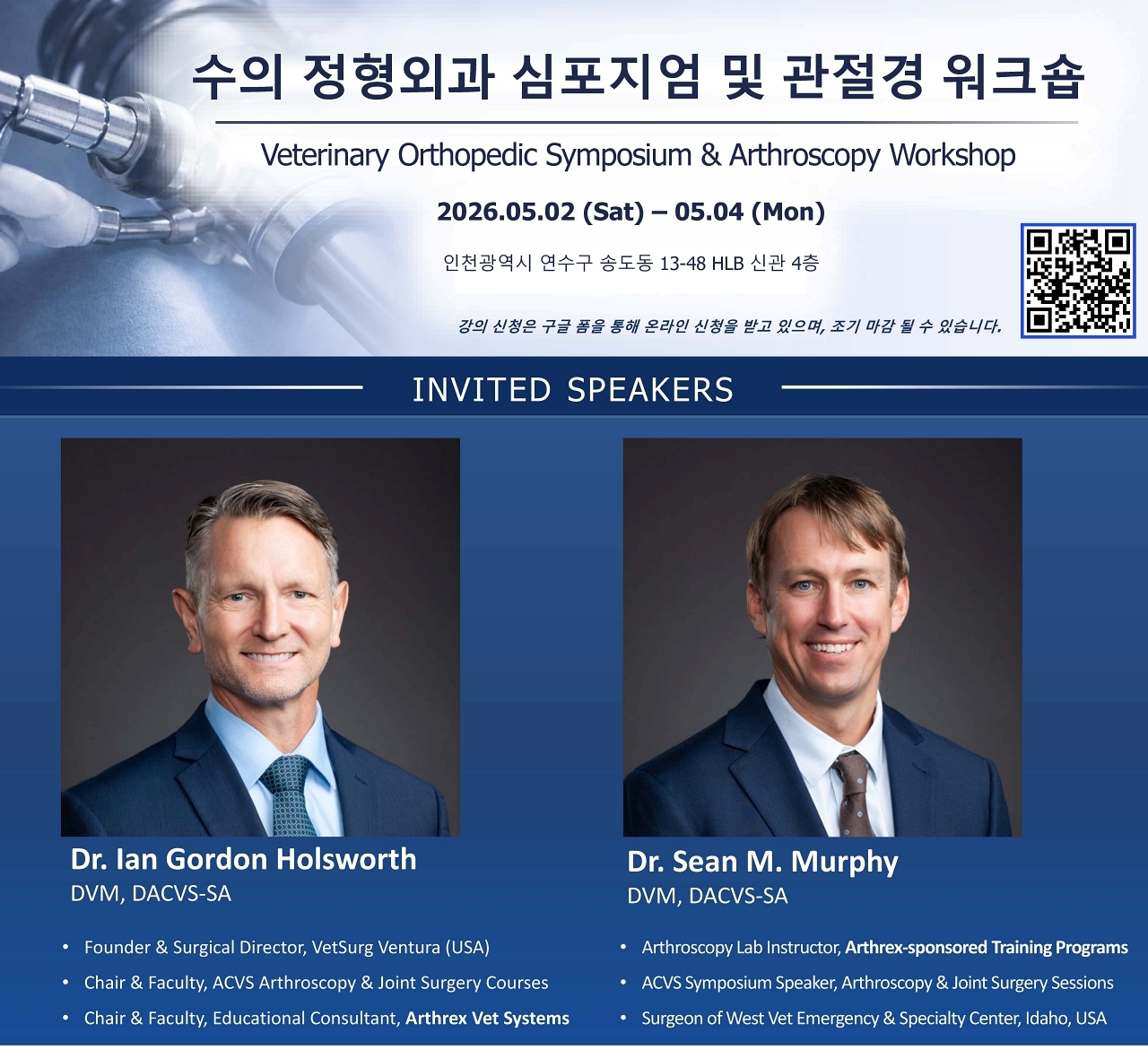 미국수의외과전문의(DACVS)인 이안 고든 홀스워스는 미국수의외과전문의협회(ACVS) 관절경 및 관절 수술 코스의 의장(Chair)을 맡고 있다. 함께 강단에 서는 션 머피(DACVS) 역시 관절경 및 관절 재건술에 정통한 전문가로, 아스렉스(Arthrex) 교육 프로그램의 관절경 실습 강사로 활약 중이다.