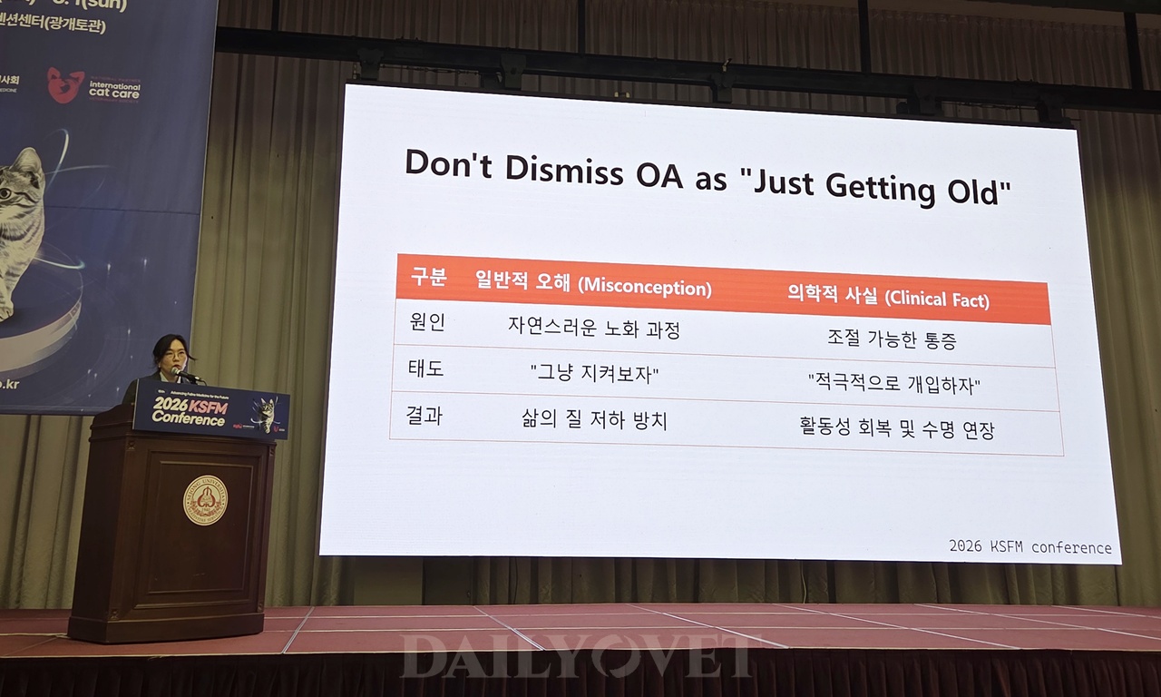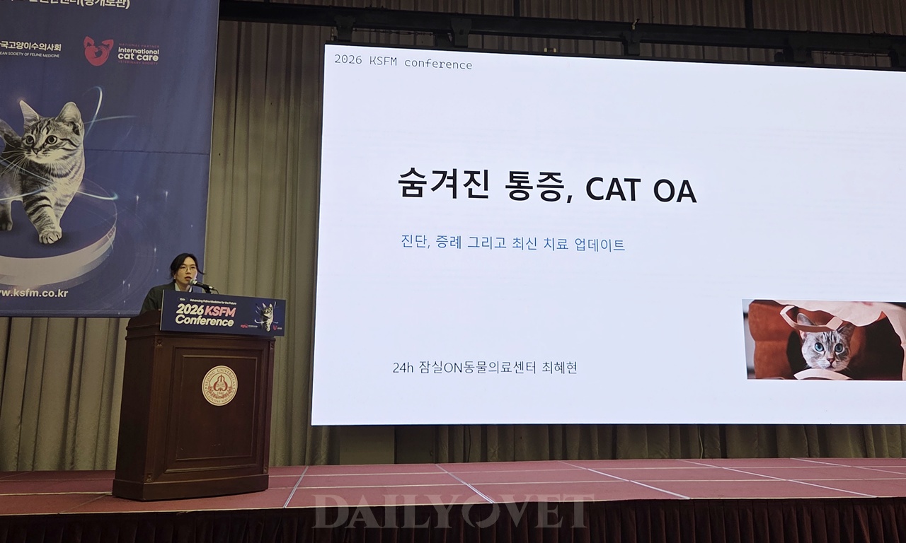 ‘숨겨진 통증, 고양이 골관절염 : 진단, 증례, 최신 치료 업데이트’를 주제로 강의한 최 원장은 “고양이 골관절염은 단순한 노화 현상이 아니라 삶의 질을 떨어뜨리는 병리적 통증 질환”임을 강조하며, “나이가 들어서 그렇다”고 단순하게 판단하지 말 것을 당부했다.
