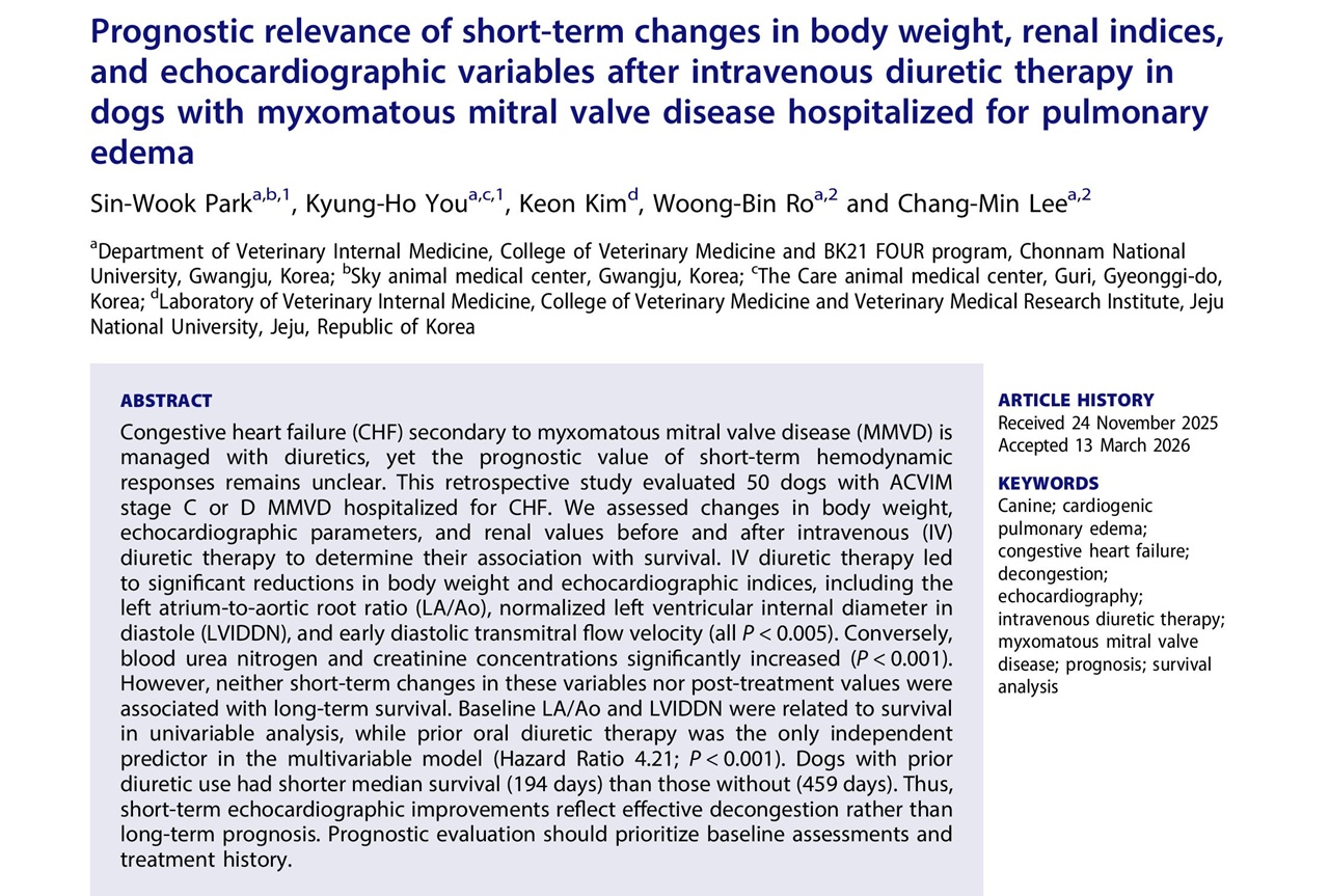 논문은 최근 수의학 분야 SCIE 저널인 Veterinary Quarterly에 게재됐다(Prognostic relevance of short-term changes in body weight, renal indices, and echocardiographic variables after intravenous diuretic therapy in dogs with myxomatous mitral valve disease hospitalized for pulmonary edema).