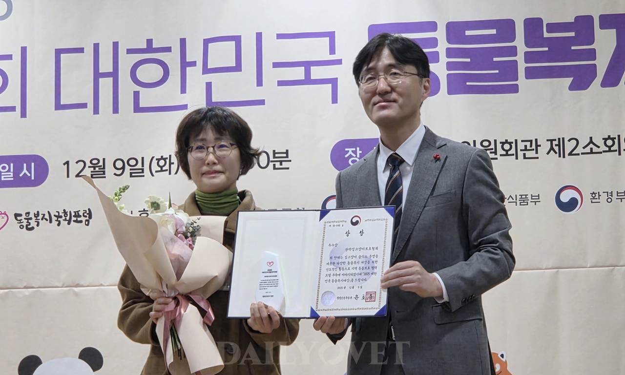 이날 시상식에서는 동물복지국회포럼 홍보대사로 가수 겸 뮤지컬배우 배다해 씨가 위촉됐다. 20년 이상 동물보호운동을 해온 배다해 씨는 2016년, 2023년에 이어 세 번째로 포럼 홍보대사가 됐다.