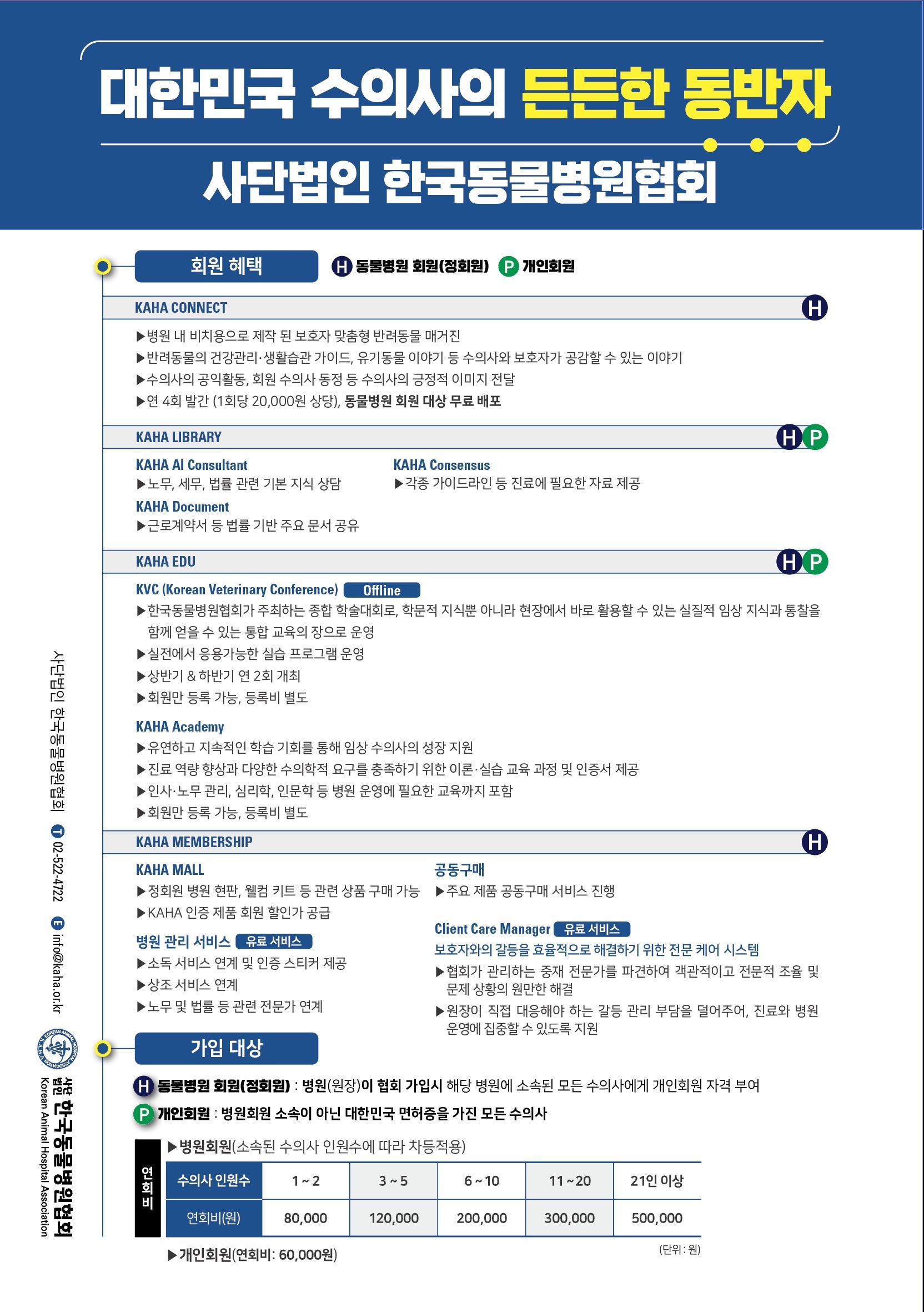 KAHA 병원회원은 동물병원 진료수의사 인원수에 따라 연회비가 달라진다.