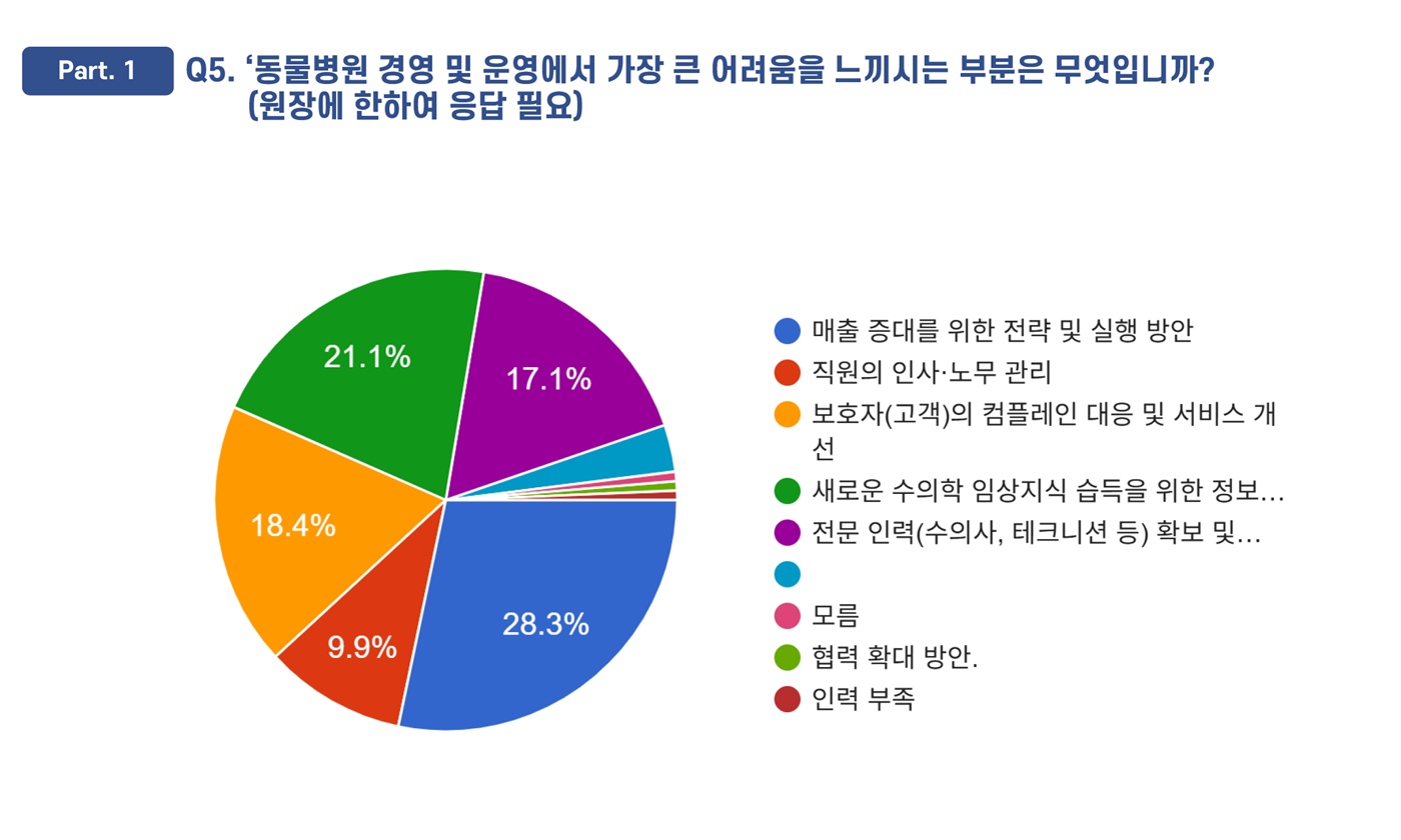 ‘동물병원 경영 및 운영에서 가장 큰 어려움을 느끼는 부분’에 대한 질문에 ‘매출 증대를 위한 전략 및 실행 방안 마련에 가장 큰 어려움을 느낀다’는 답변이 1위를 차지했다(28.3%). 그 뒤를 ‘새로운 수의학 임상지식 습득을 위한 정보 접근(21.1%)’, ‘보호자(고객)의 컴플레인 대응 및 서비스 개선(18.4%)’, ‘전문 인력(수의사, 테크니션 등) 확보 및 교육의 어려움(17.1%)’이 이었다.