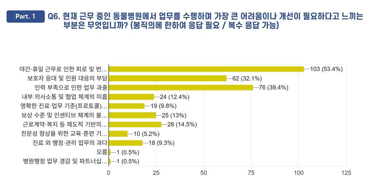 진료수의사(봉직의)의 경우, 동물병원에서 일하면서 느끼는 가장 큰 어려움으로 ‘야간·휴일 근무로 인한 피로 및 번아웃’을 꼽았다(53.4%, 중복포함).