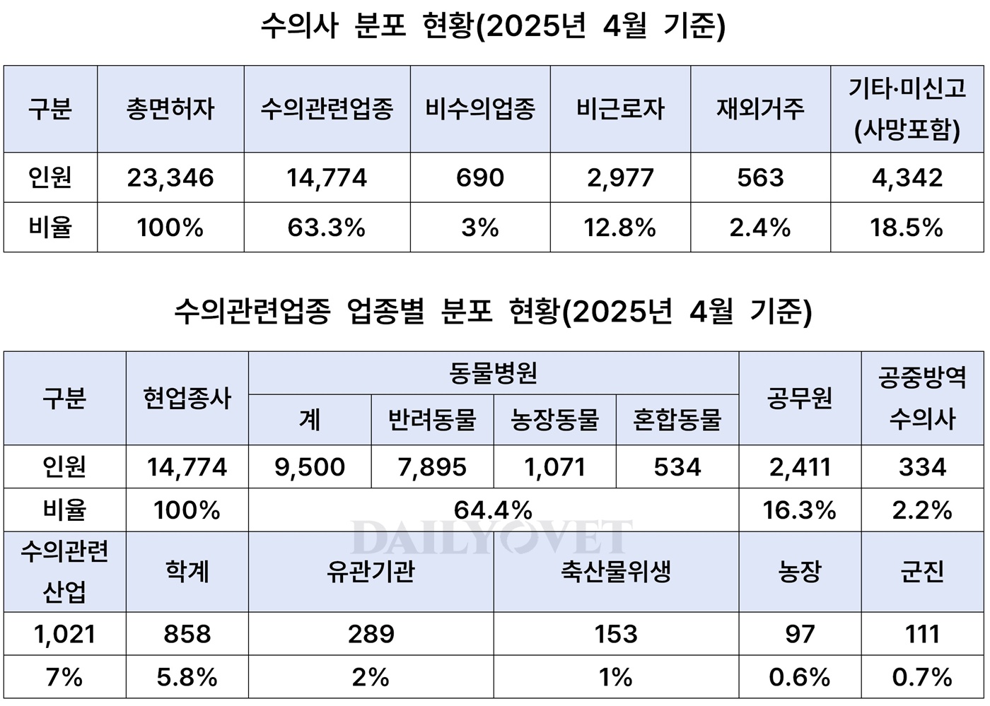 2025년 4월 기준 대한수의사회 자료에 따르면, 올해까지 수의사 면허를 받은 사람은 총 23,346명이다. 그중에서 사망했거나 신상신고를 하지 않아서 현재 상태를 파악할 수 없는 사람이 4,342명이다.