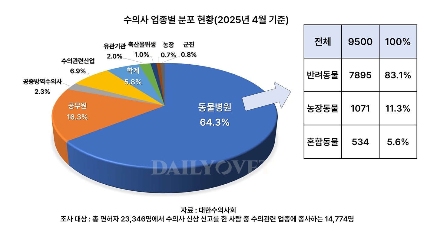 임상수의사 9,500명 중 반려동물 임상수의사가 7,895명(83.1%), 농장동물 임상수의사가 1,071명(11.3%), 혼합동물 임상수의사가 534명(5.6%)이었다. 혼합동물 수의사도 반려동물 진료를 보기 때문에, 사실상 임상 수의사 10명 중 9명은 반려동물 진료를 하고 있었다.