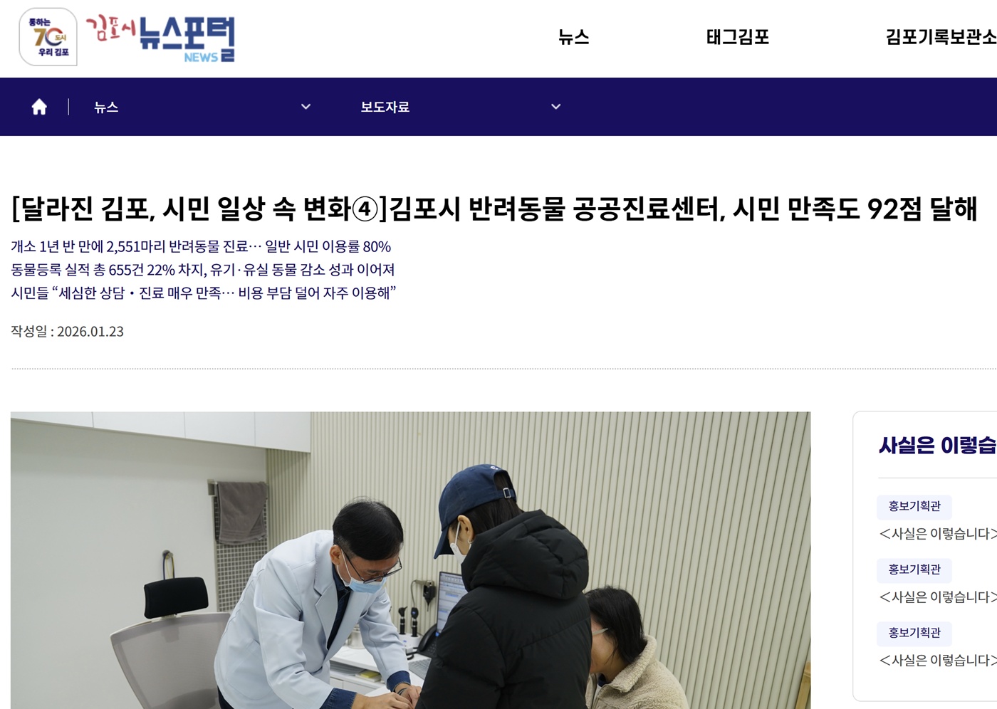 김포시는 지난 1월 23일 ‘김포시 반려동물 공공진료센터, 시민 만족도 92점 달해’라는 제목의 자화자찬 보도자료를 배포했다.