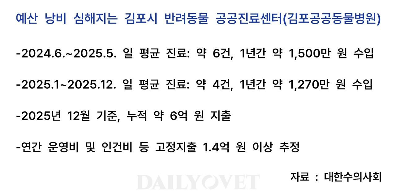 대한수의사회가 김포시 공공동물병원(김포시 반려동물 공공진료센터)이 예산낭비라고 비판했다. 하루 평균 4마리를 진료 보는데 매년 수억 원의 세금을 투입하고 있다는 지적이다.