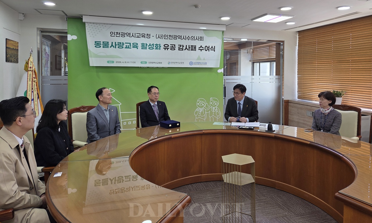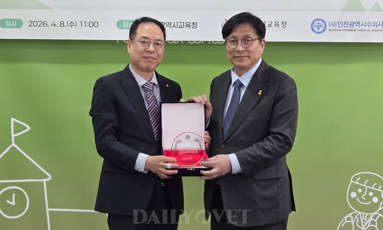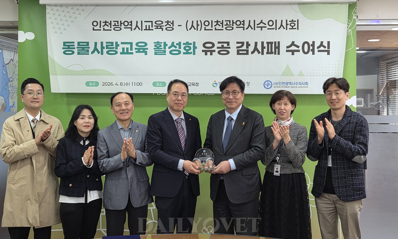 인천시수의사회는 “인천광역시 관내 청소년들이 동물과 사람을 하나의 공동체로 이해하고, 생명의 존엄과 생명 존중의 가치를 함양할 수 있도록 ‘수의사가 찾아가는 동물사랑교육’을 적극 추진해 동물복지와 인성교육 발전에 크게 기여했다”며 도성훈 교육감에게 감사패를 전달했다.