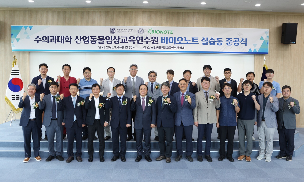 이날 준공식에는 조영식 의장, 조병기 바이오노트 대표, 조제열 수의과대학 학장, 양태진 그린바이오과학기술연구원 원장, 이인형 산업동물임상교육연수원 원장, 최준원 국제농업기술대학원 원장 등 주요 인사들이 참석해 국내 산업동물임상교육 및 연구 발전의 새로운 이정표가 될 바이오노트 실습동의 출범을 축하했다.