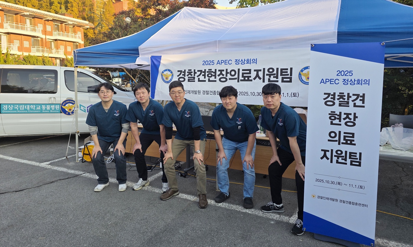 이번 ‘2025 APEC 정상회의 경찰견현장의료지원팀’에는 경상국립대 수의대 이동빈 연구부학장(수의외과학 교수)을 비롯해 부산여대 동물보건과 이영덕 교수, 부산여대 동물보건과 겸임교수인 부산 UN동물의료센터 여재승 원장(수의학과 2005학번), 부산 더휴동물의료센터 문희섭 원장(수의학과 2008학번), 수의학과 대학원 외과 장종완 수의사, 내과 허성원 수의사, 수의사 자격을 보유한 김세민 교수요원까지 총 7명의 수의사가 참여했다.