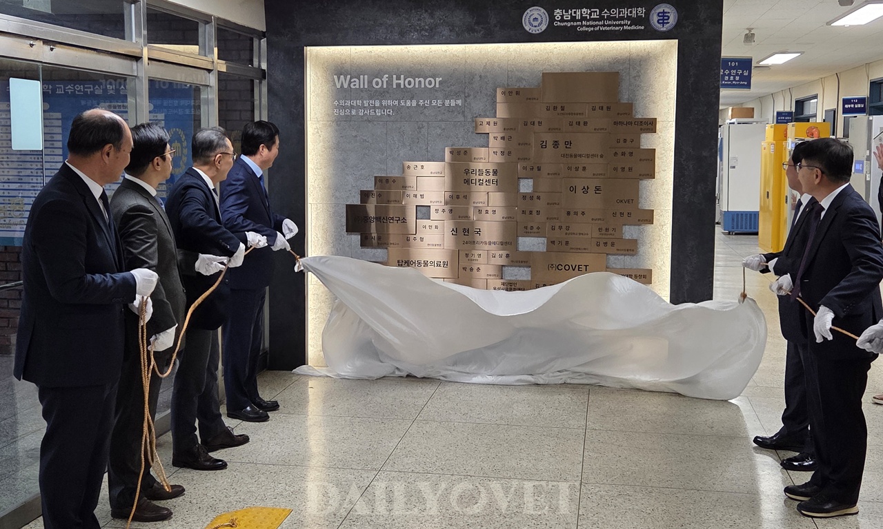 충남대학교 수의과대학(학장 정주영)이 27일(목) 오후 수의학관 1층에서 ‘발전기금 기부자벽(Wall of Honor)’ 제막식을 개최했다.