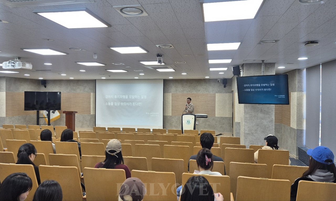 8일(월) 전남대학교동물병원 박남용홀에서 전남대 수의대 본과 1학년을 대상으로 한 특강이 열렸다. 특강에서는 백두동물병원의 윤창진 원장과 나라동물병원의 최홍선 원장이 연자로 나섰다.