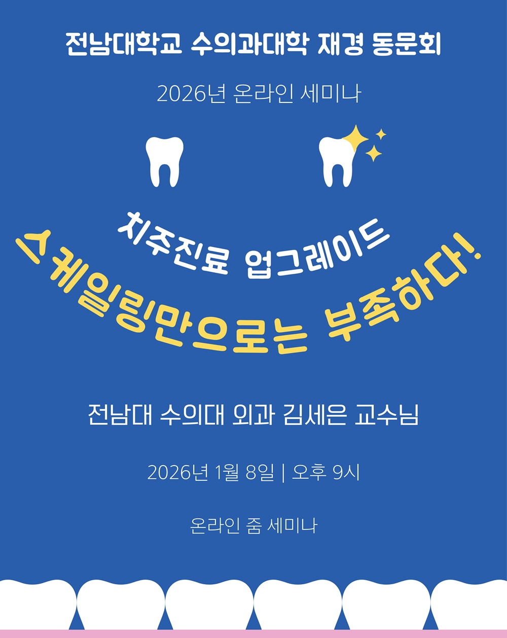 전남대학교 수의과대학 재경동문회(회장 이승철)가 8일(목) 저녁 9시, 동문 원장들을 대상으로 온라인 치과 세미나를 개최했다. 이번 세미나는 서울 및 수도권에서 개원 중인 동문 원장들이 임상 현장에서 자주 접하는 치주질환 환자에 대한 진료 역량을 높이기 위해 마련됐다.