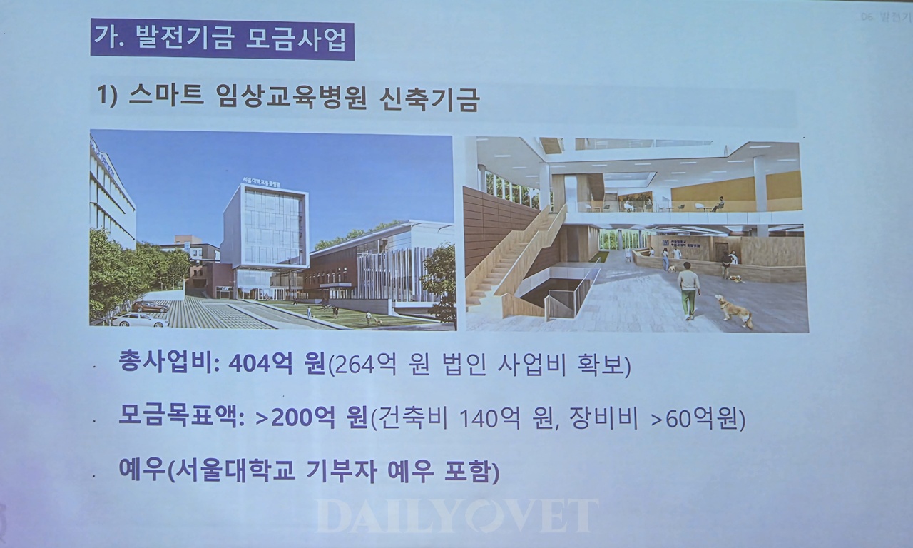 스마트 임상교육 동물병원 신축에 투입할 총 사업비는 404억 원 규모다. 이중 264억 원을 국고에서, 나머지를 자체 재원으로 확보한다. 자체 재원은 동문들의 후원과 관련 기업의 기부로 마련한다. 건축비에 더해 첨단의료장비를 갖추기 위해 자체 재원 200억 원을 마련하는 것이 목표다.