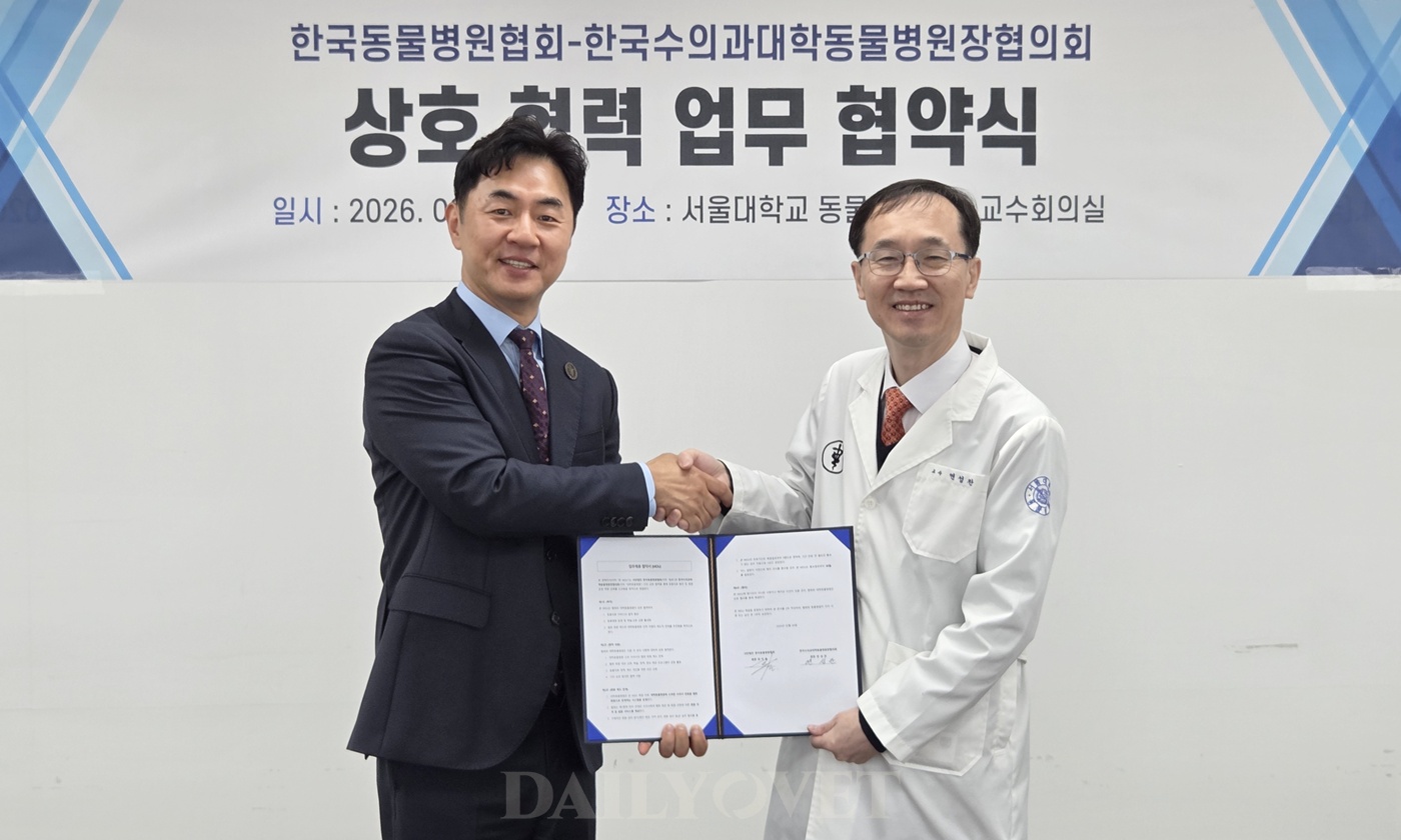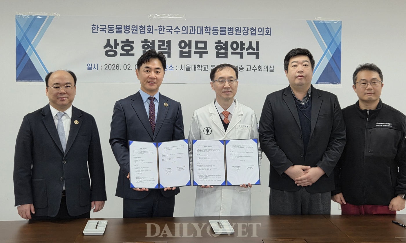 한국동물병원협회(KAHA, 회장 최이돈)와 전국대학동물병원장협의회(한국수의과대학동물병원장협의회, 회장 연성찬)가 4일(수) 서울대학교동물병원에서 상호 협력 업무 협약(MOU)을 맺었다.
