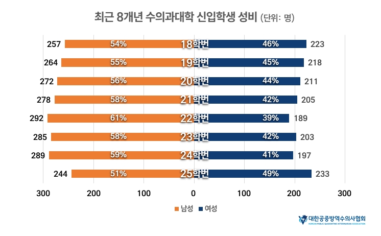 2018년부터 2025년까지 최근 8년간 국내 수의과대학에 입학한 신입생들의 남녀 성비가 평균 1.3대1로 나타났다. 남자 신입생이 여자 신입생보다 많은 경향은 8년 내내 유지됐다.
