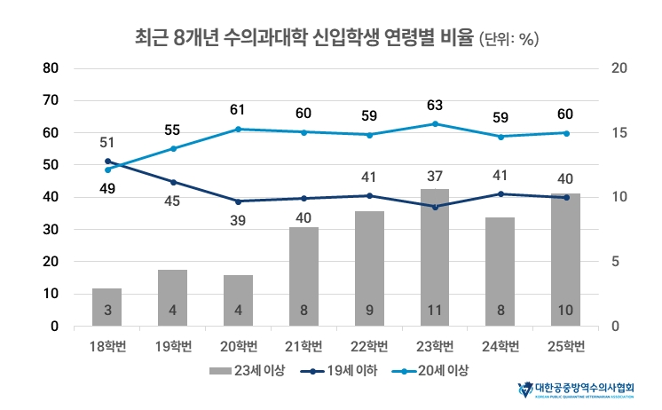 N수생의 비율은 높아졌다. 최근 8개년간 수의과대학 신입학생 중 현역으로 입시를 치르고 입학하는 학생(만 19세)의 비율은 51%에서 40%까지 낮아졌다. 반면 2회 이상 입시를 치르고 입학하는 학생(N수생, 만 20세 이상)의 비율은 60%까지 높아졌다.