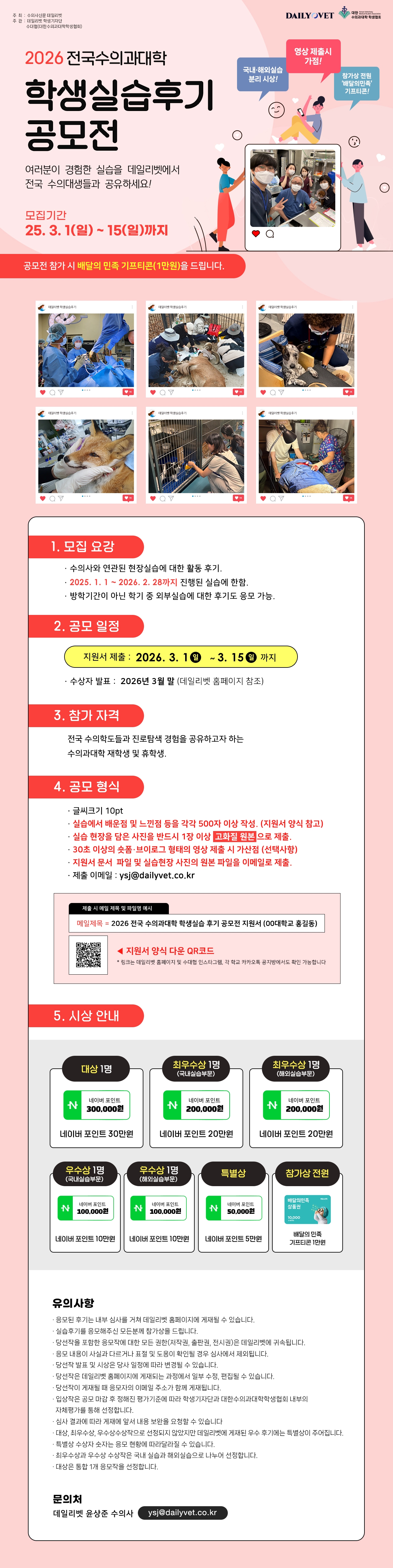 전국 수의과대학 학생들의 실습 경험을 공유하는 ‘2026 전국 수의과대학 학생 실습 후기 공모전’이 열린다.