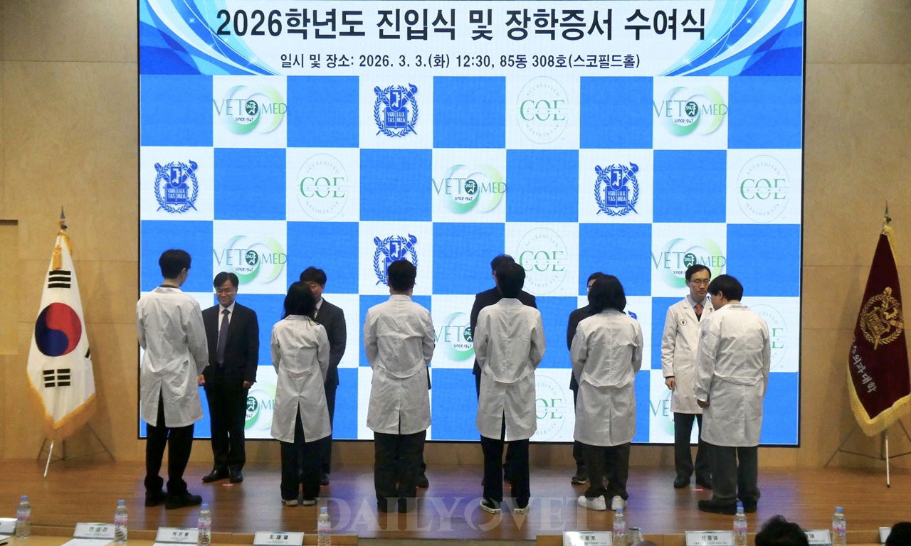 서울대학교 수의과대학(학장 조제열)이 3일(화) 서울대학교 스코필드홀에서 2026학년도 본과 진입식 및 장학증서 수여식을 개최했다.