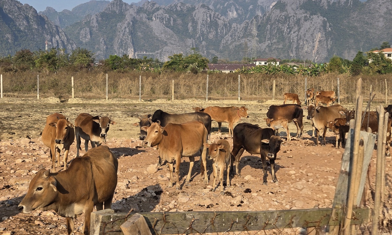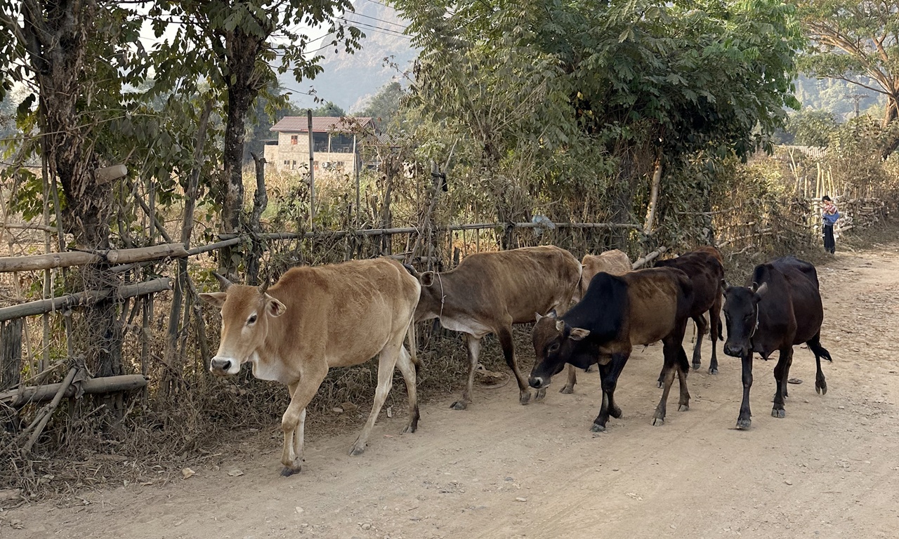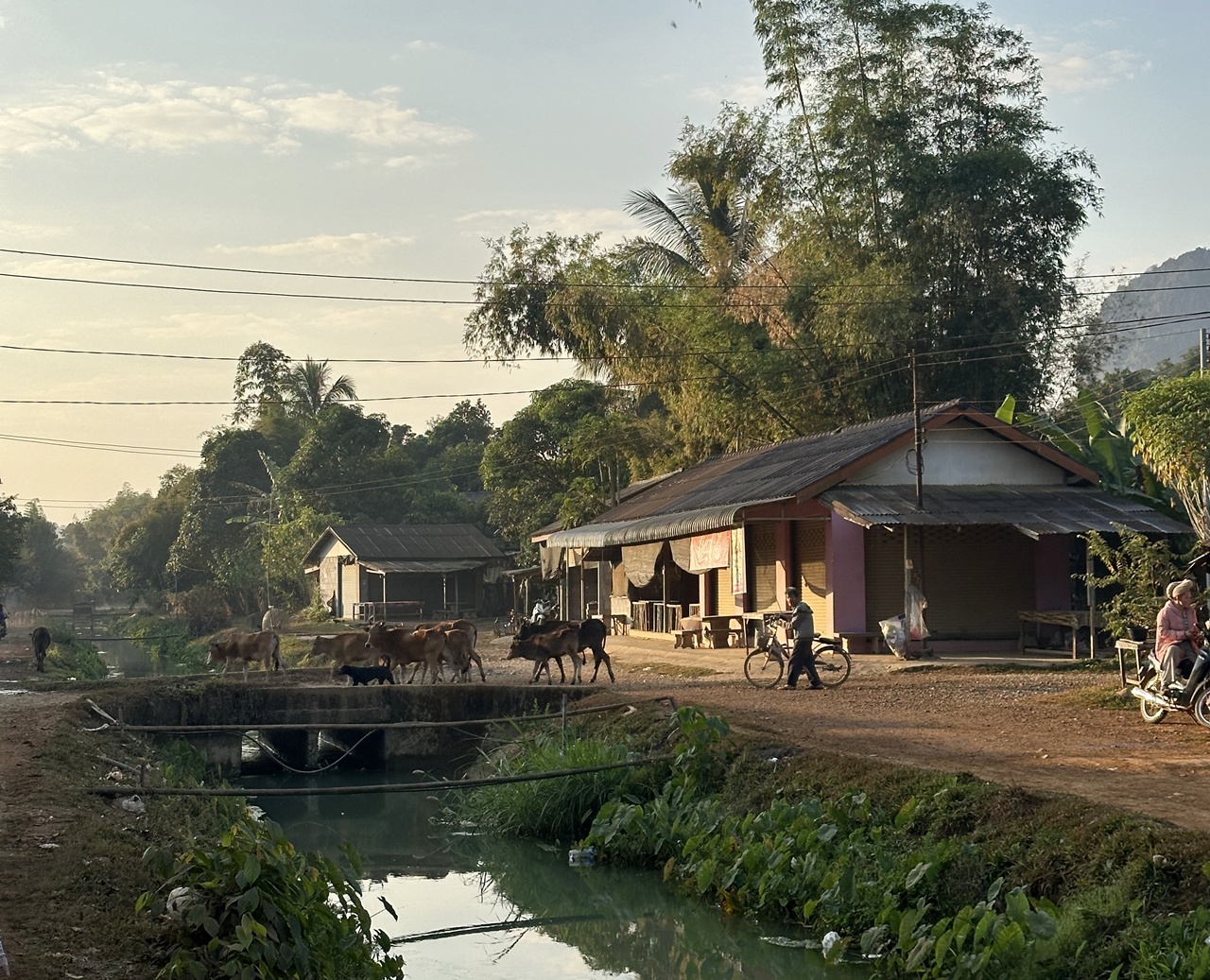 마을에 들어가니 여러 마리의 소가 자유롭게 걸어 다니고 있었다. 라오스에는 소가 그냥 돌아다닌다고 들었지만 실제로 보니 되게 낯설고 신기했다. 마을에 흐르는 강을 따라 이동하며 마을을 둘러봤는데 그 풍경이 정말 너무 아름다웠다. 아침 햇살을 맞으며 하루를 시작하는 마을 사람들, 여유롭게 걸어 다니는 소들과 울창한 나무의 모습에 마치 다른 세상에 온 것 같은 기분이 들었다.