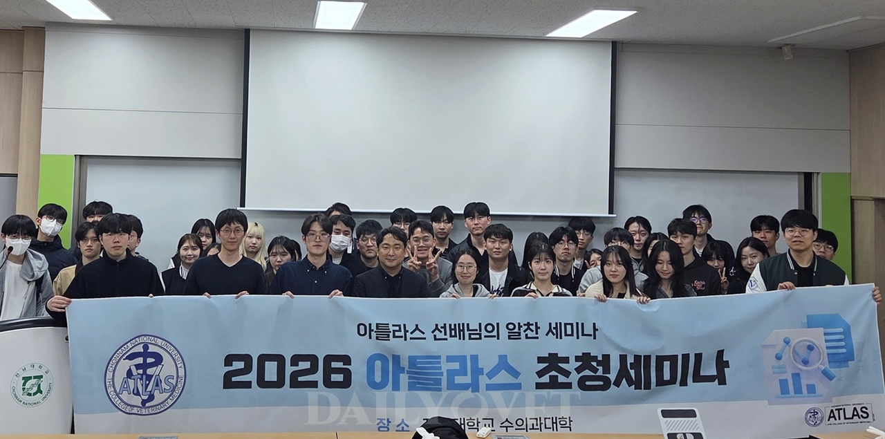 전남대학교 수의과대학 해부학술동아리 ATLAS(아틀라스, 회장 이원형)가 4월 1일(수) 수의대 2호관에서 ‘아틀라스 초청 진로세미나’를 열고, 아틀라스 24기이자 광주 24시노아동물메디컬센터의 양하영 대표원장을 초청해 소동물임상 분야의 변화와 미래 흐름을 짚어보는 시간을 마련했다. 세미나 주제는 ‘소동물임상에 대한 지난 5년간 변화 및 앞으로 10년간 예측’이었다.
