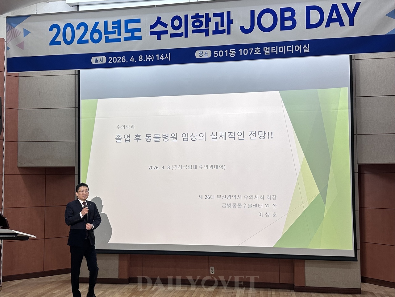 지난 4월 8일(수) 경상국립대학교 수의학관 멀티미디어실에서 수의학과 ‘JOB DAY’의 일환으로 특별 강연이 개최됐다. 이번 특강에서는 제26대 부산광역시수의사회 회장으로 당선된 금빛동물수술센터 이상훈 원장이 ‘졸업 후 동물병원 임상의 실제적인 전망’을 주제로 강연했다.