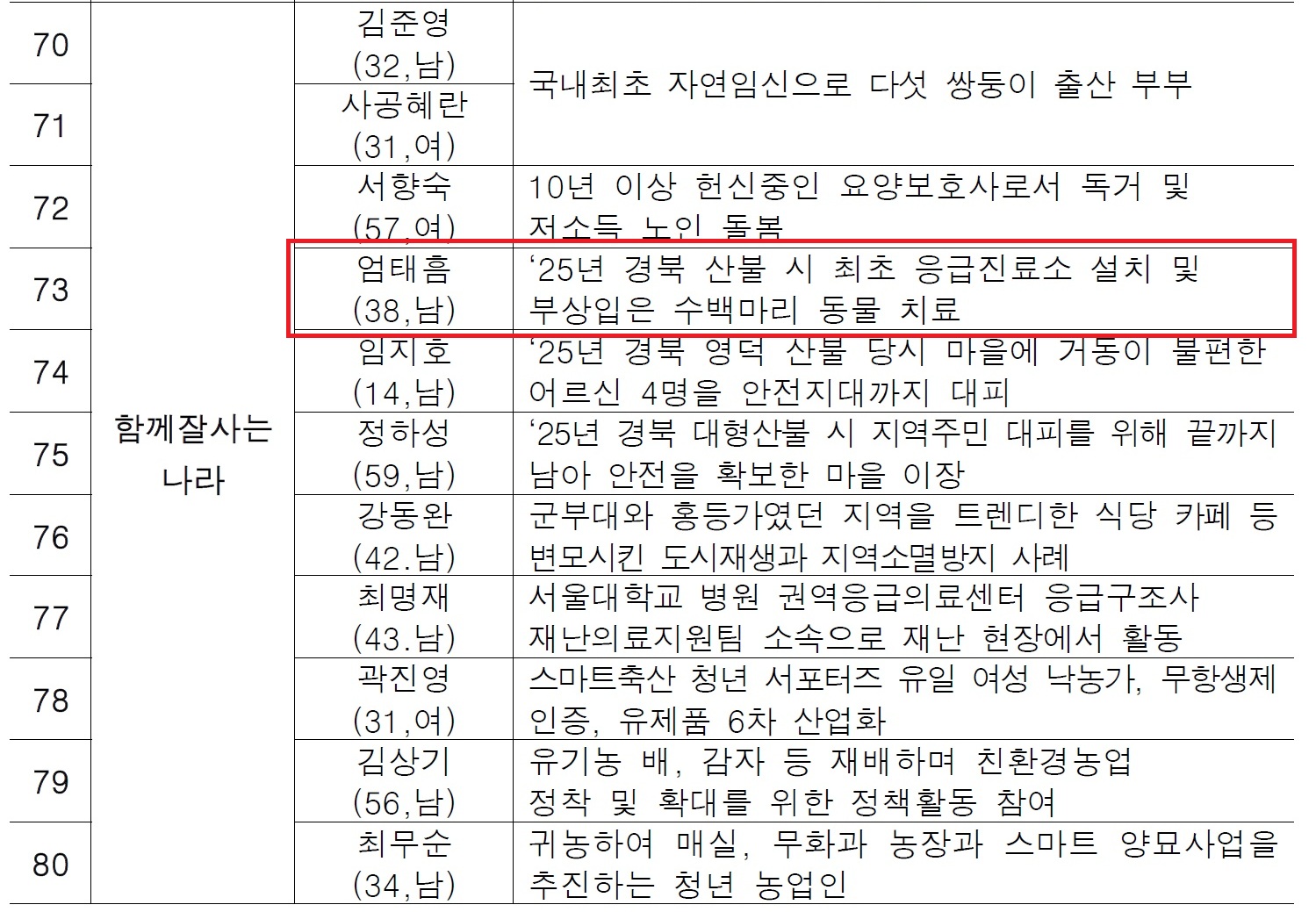 탄핵 시위 때 장갑차를 막은 부부, 과학기술을 통해 새로운 성장산업을 이끄는 독자 AI 파운데이션 모델 프로젝트 기업 대표, 안전한 대한민국을 위해 노력하는 국군대전병원 이국종 원장과 위기 때마다 국민 안전을 지켜온 구조대원들, 제78회 칸국제영화제에서 한국 최초 학생 부문 1등을 수상해 문화강국의 이름을 높인 젊은 영화감독 허가영 씨, 2002년 한일월드컵 대표팀 수석코치를 역임한 박항서 감독, 알파고와의 세기의 대결을 펼쳤던 바둑기사 이세돌 씨, 국내 최초 자연임신으로 다섯쌍둥이를 출산한 김준영·사공혜란 부부 등이 국민대표로 선정된 가운데, 수의사 중에서는 유일하게 넬동물의료재단의 엄태흠 원장이 국민대표로 나섰다.