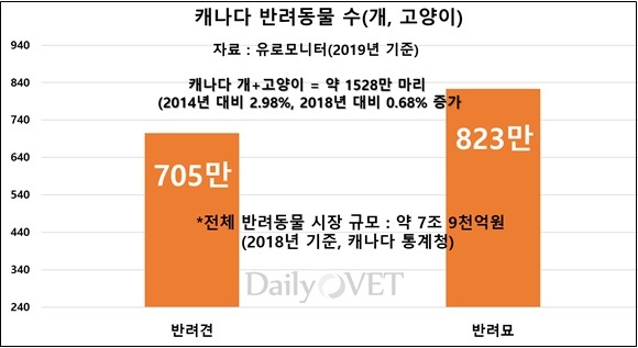 캐나다의 반려견·반려묘 수는 2019년 기준 전년 대비 0.68% 증가한 약 1528만 마리로 추정됐다. 반려견이 약 705만여 마리, 반려묘가 약 823만여 마리인데 5년 전과 비교하면 2.98% 증가한 수치다(유로모니터).