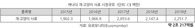 개·고양이 사료 시장 규모는 최근 5년간 연평균 약 4.2%씩 성장해, 2019년 기준 C$22억 5,170만(약 2조 217억원) 수준까지 증가했는데, 특히 전년(2018년) 대비 4.6% 증가했다.
