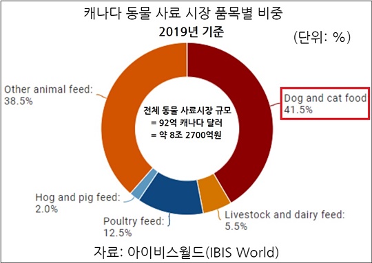 IBIS에 따르면, 2019년 기준 캐나다의 전체 동물 사료 시장 규모는 약 C$92억(약 8조 2700억원)규모이며, 가장 큰 시장이 개·고양이 사료 시장(41.5%)이었다. 그 뒤를 기타(38.5%), 가금(12.5%), 소(5.5%), 돼지(2.0%) 사료가 이었다.