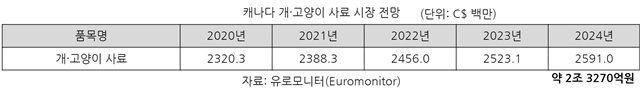 앞으로도 성장이 예상된다. 유로모니터에 따르면, 캐나다의 개·고양이 사료 시장은 지속적으로 커져 2024년에는 C$25억 9100만(약 2조 3270억원)규모가 될 것으로 전망됐다(연평균 2.8% 성장).