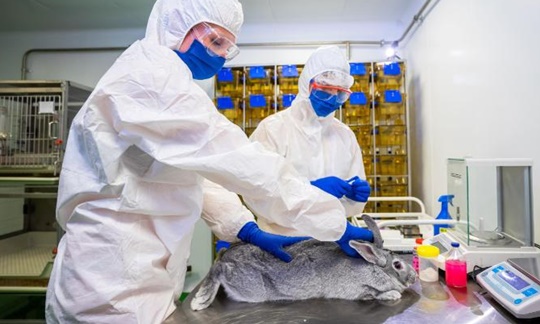 러시아 과학자들이 코로나19 백신 개발 과정에서 토끼에게 접종하는 모습(2020년 12월, 러시아 블라디미르) @러시아 연방동물보건센터