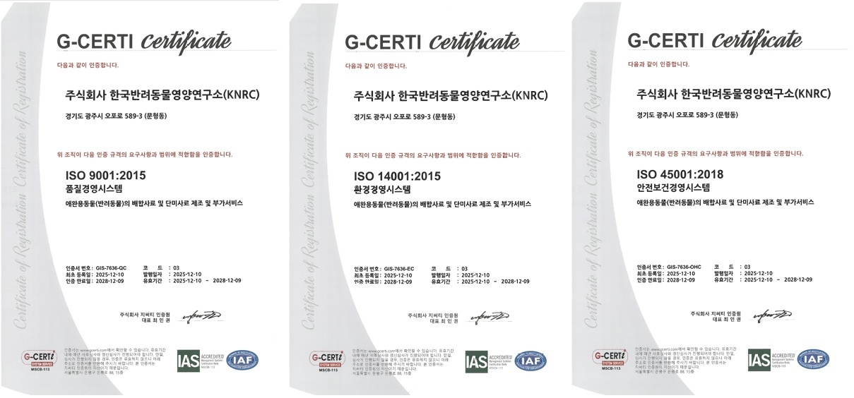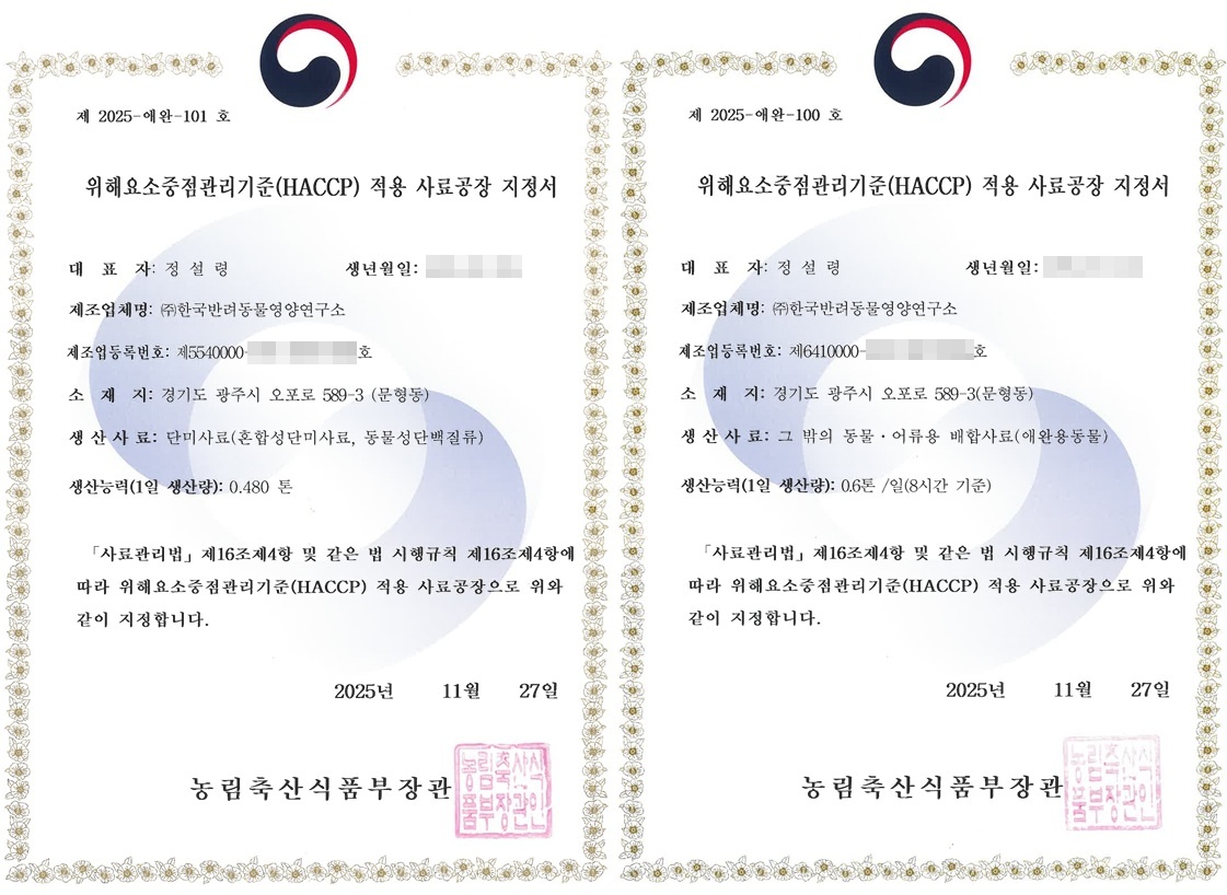 한국반려동물영양연구소, HACCP 및 ISO 3종 인증..진정성·전문성 재차 입증