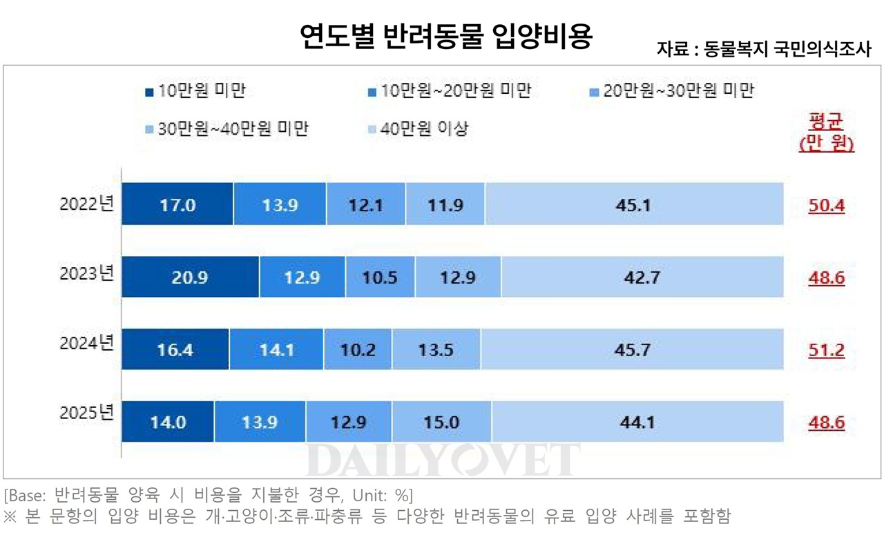 반려동물 평균 입양(분양) 비용은 2022년부터 2025년까지 42~45만원 정도로 비슷한 수준을 유지했다. 개·고양이뿐만 아니라 조류, 파충류 등 다양한 반려동물의 입양 또는 분양 비용의 평균 금액이다.