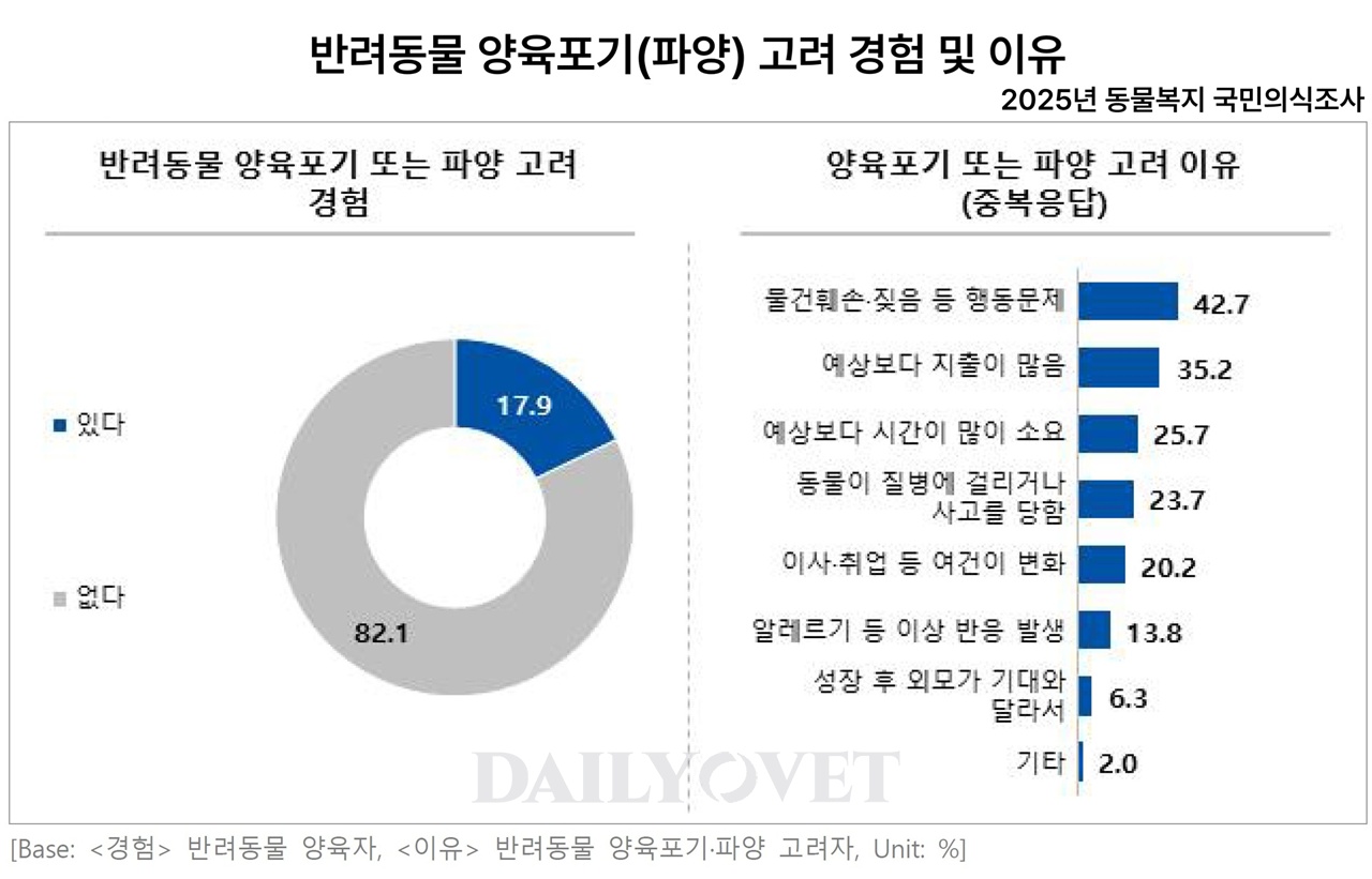 반려동물 양육자 17.9% “양육포기 또는 파양 고려해 본 적 있어”