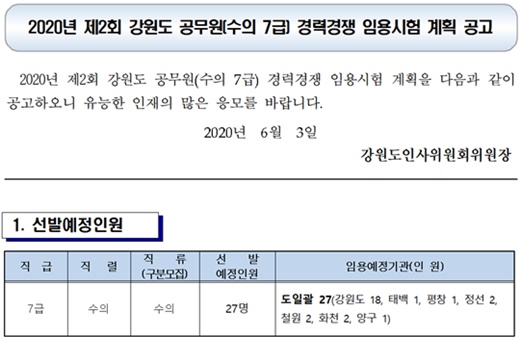 강원도가 수의사 공무원 27명을 채용한다. 이번에 채용하는 공무원은 수의7급이며 총 27명을 선발한다.