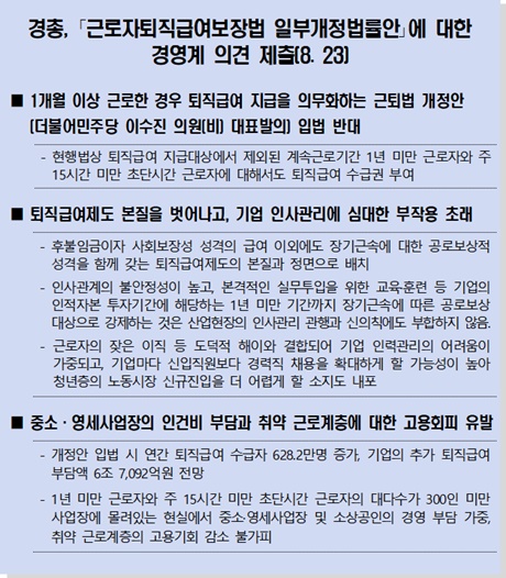 경총은 이에 대해 “퇴직급여제도의 본질을 벗어나고 심각한 부작용을 초래할 것”이라고 경고했다.
