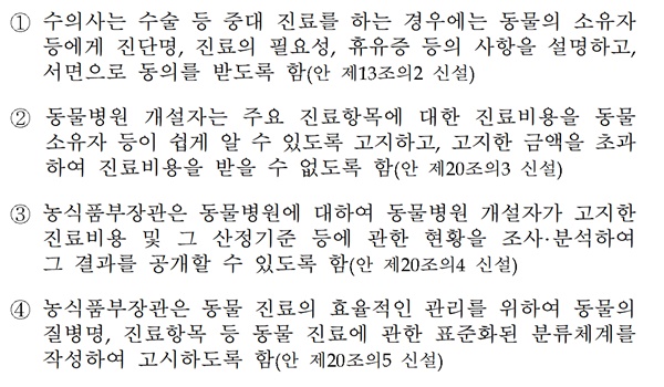 여기에, 동물병원이 고지한 진료비용 및 산정기준을 정부가 조사·분석하여 결과를 공개하는 내용과 질병명·진료항목 표준화 분류체계를 마련하는 내용도 담겼다.