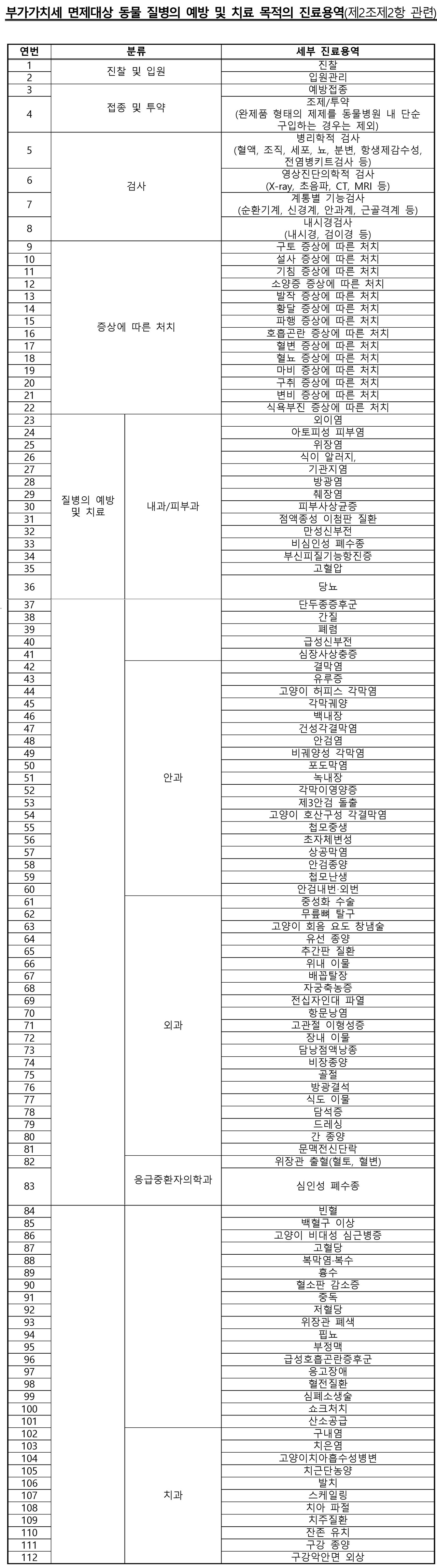 기존 면제 대상이던 102종에 더해 구취, 변비, 식욕부진, 간 종양, 문맥전신단락(PSS), 치아 파절, 치주질환, 잔존유치, 구강 종양, 구강악안면 외상이 추가됐다(총 112종).