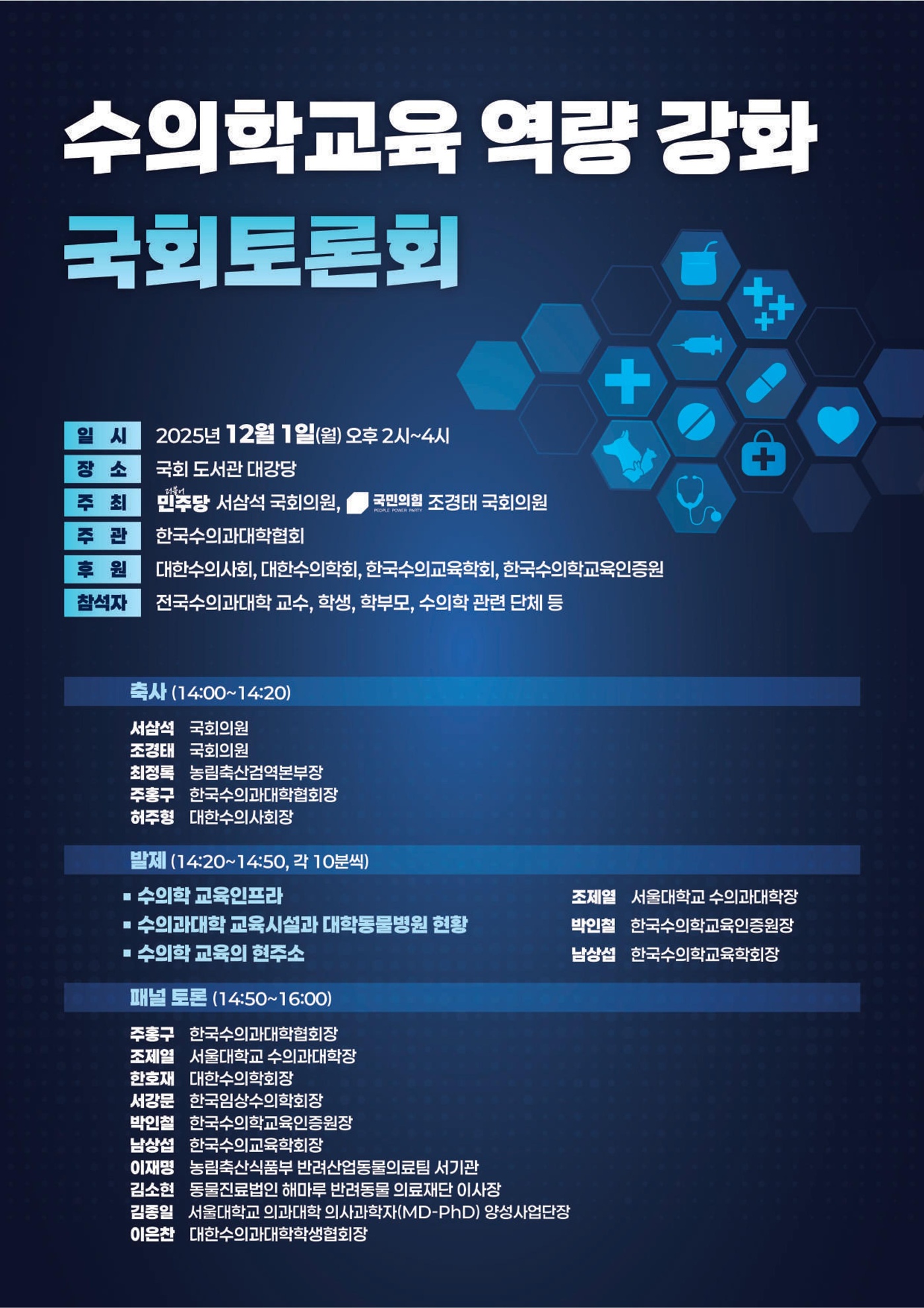 더불어민주당 서삼석 국회의원, 국민의힘 조경태 국회의원이 주최하는 ‘수의학교육 역량 강화 국회토론회’가 12월 1일(월) 오후 2시부터 4시까지 국회 도서관 대강당에서 개최된다.