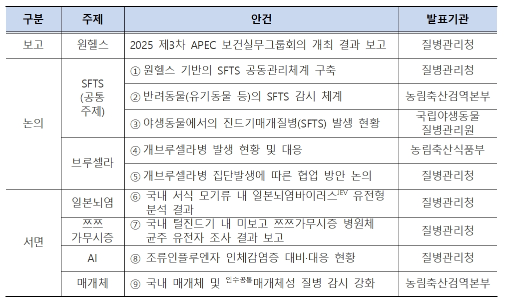 대책위는 중증열성혈소판감소증후군(SFTS)을 공동 주제로 선정하고 사람(질병청), 반려동물(검역본부), 야생동물(국립야생동물질병관리원)에서의 질병 감시 현황과 공동관리체계 구축 방안을 공유했다.