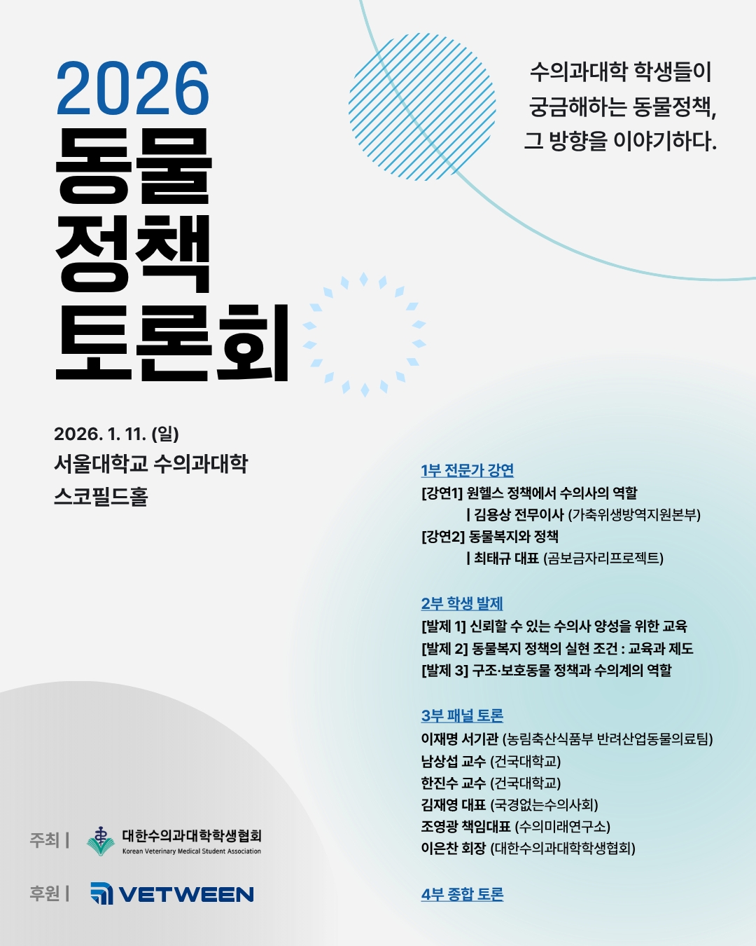 대한수의과대학학생협회(수대협, 회장 이은찬)가 주최하는 ‘2026 동물정책토론회’가 오는 2026년 1월 11일(일) 서울대학교 수의과대학 스코필드홀에서 열린다.