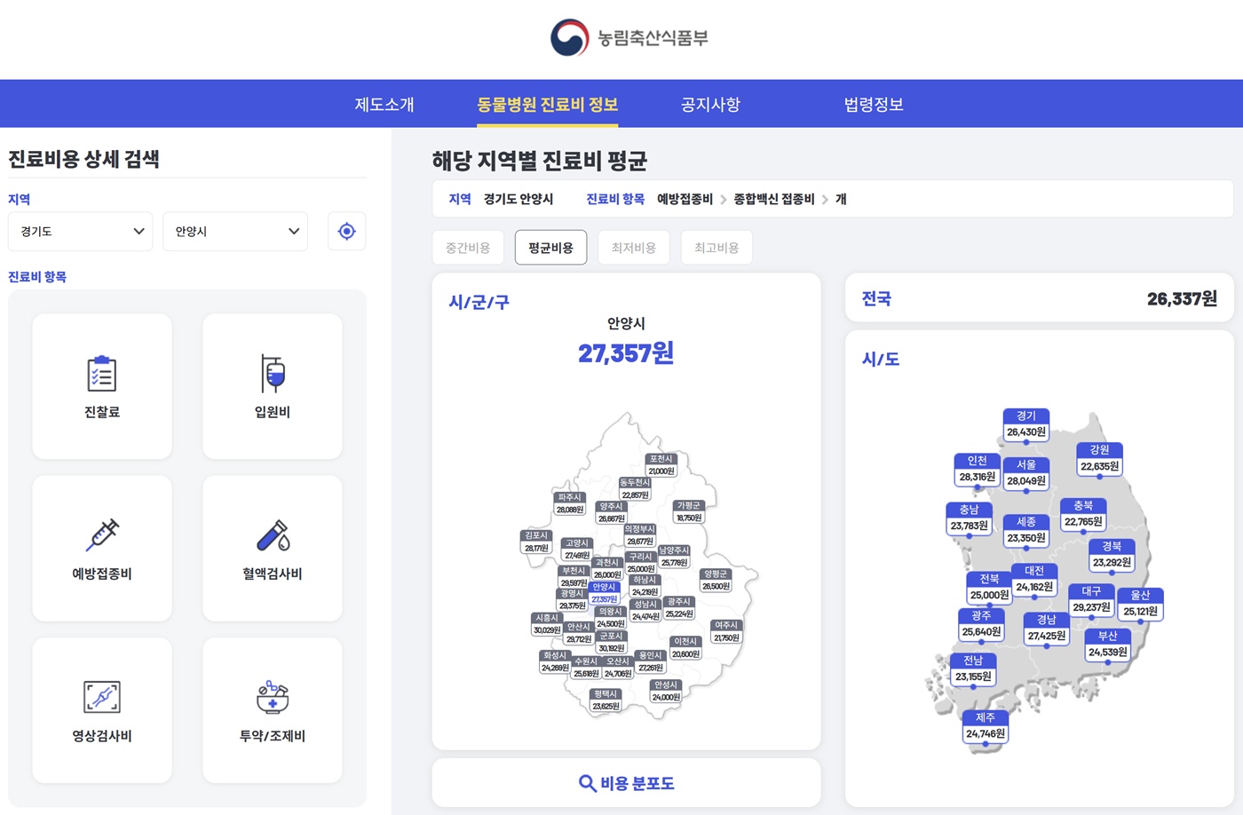 동물진료비 현황조사는 동물병원이 게시한 진료비를 조사한 뒤, 광역지자체(시·도), 기초지자체(시·군·구) 별로 중간비용, 평균비용, 최저비용, 최고비용을 공개하는 방식으로 이뤄진다. 누구나 온라인 사이트에서 비교해 볼 수 있다.