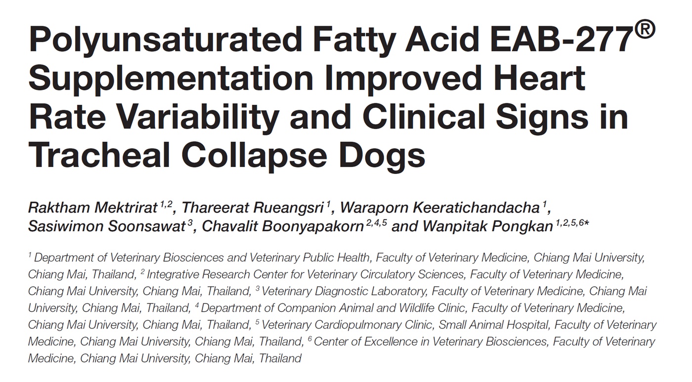 치앙마이 수의과대학 연구진이 발표한 논문에 따르면, 기관허탈을 가진 개에 EAB-277®을 병용 투여한 결과 투약군에서 산화스트레스 및 염증 수치가 유의미하게 감소하고, 심박변이도(HRV)가 개선됐다.