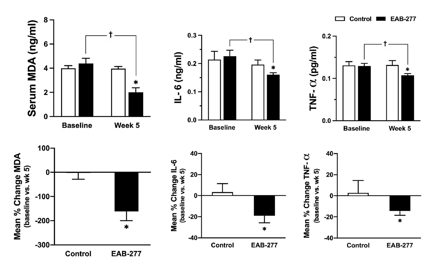 두 그룹 모두 임상 증상이 5주 전보다 개선됐는데, 특히 EAB-277® 투약군에서 산화스트레스 지수인 MDA(Malondialdehyde)와 염증성 사이토카인인 TNF-α와 IL-6가 유의미하게 감소했고, 심박변이도(HRV, Heart rate variability)도 개선됐다. HRV는 교감신경-미주신경 균형 및 산화 스트레스 수준을 평가하는 수치로, 심폐 질환 평가에 널리 사용된다.