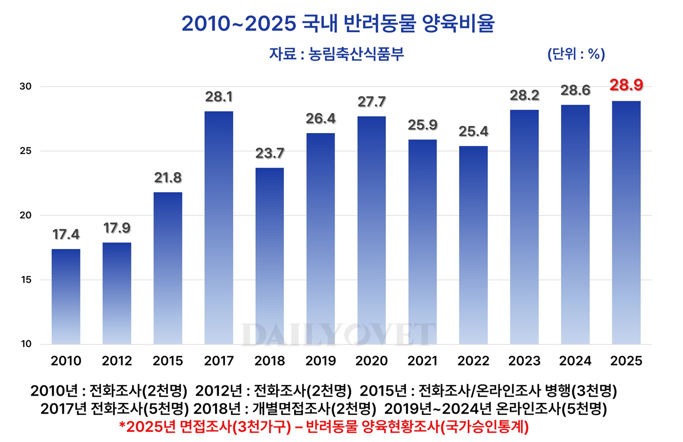 2025년 반려동물 양육현황조사는 지난해 10월 31일부터 12월 12일까지 전문 조사원이 전국 17개 시·도의 3,000가구를 직접 방문해 면접조사하는 방식으로 실시됐다(95% 신뢰수준에서 표본오차 ±1.79%P).